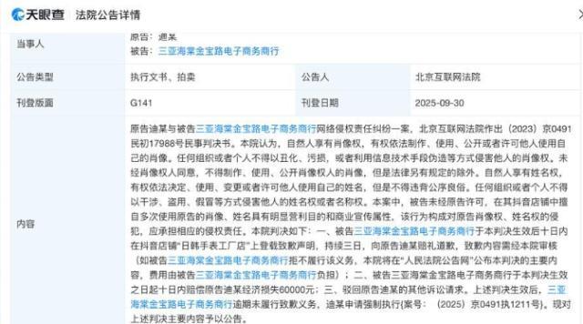 此外,同日,三亚海棠金宝路电子商务商行因构成对迪丽热巴肖像权、姓名权的侵犯,被判决向原告迪丽热巴公开赔礼道歉,赔偿经济损失6万元。三亚海棠金宝路电子商务商行未履行生效判决确定的致歉义务,迪丽热巴申请强制执行。