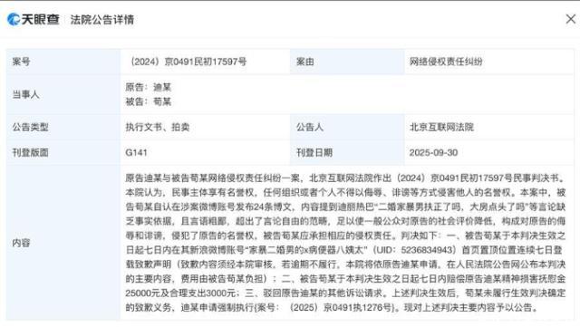 天眼查法律诉讼信息显示,近日,北京互联网法院刊登公告称,迪丽热巴与被告荀某网络侵权责任纠纷一案中,被告荀某发布的博文缺乏事实依据,且言语粗鄙,构成对迪丽热巴的侮辱和诽谤,侵犯了其名誉权。判决荀某向原告迪丽热巴公开赔礼道歉,赔偿精神损害抚慰金2.5万元、合理支出3000元,荀某未履行生效判决确定的致歉义务,迪丽热巴申请强制执行。