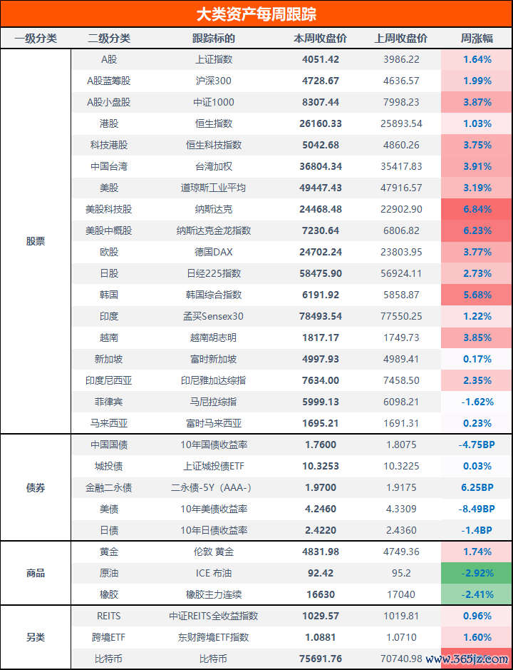本周,A股全线大涨,沪指上涨1.64%,沪深300上涨1.99%,中证1000上涨3.87%;港股方面,恒生指数上涨1.03%,恒生科技指数上涨3.75%。