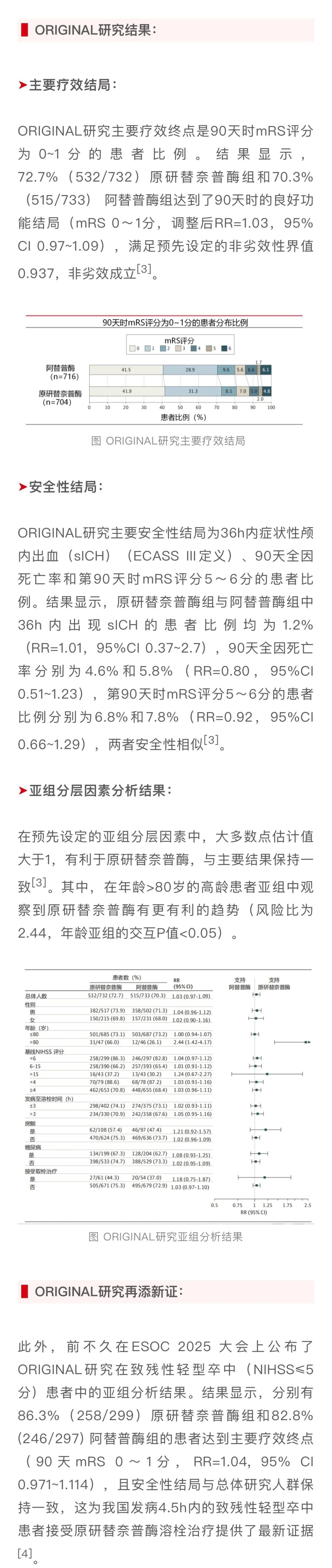 3.ORIGINAL研究是原研替奈普酶在中国开展的申请AIS适应症的Ⅲ期注册研究,进一步证实了原研替奈普酶在中国AIS患者中疗效非劣于阿替普酶,且亚组分析进一步支持其在致残性轻型卒中患者中的应用,为其临床应用提供高质量循证支撑。