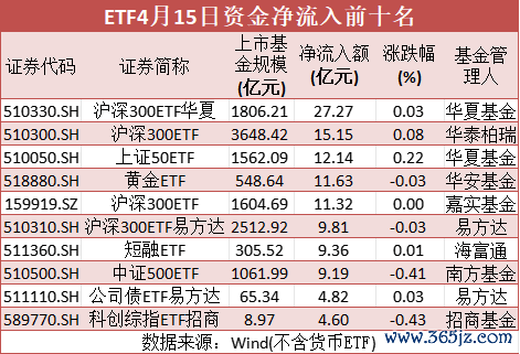 数据显示,4月15日,华夏基金旗下沪深300ETF资金净流入达到27.27亿元,位居全市场首位。华泰柏瑞、嘉实、易方达旗下沪深300ETF资金净流入分别达到15.15亿元、11.32亿元、9.81亿元,均跻身当日ETF资金净流入榜前列。