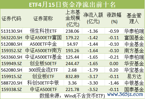 其他宽基ETF中,4月15日,华夏上证50ETF资金净流入金额达到12.14亿元,南方中证500ETF资金净流入9.19亿元,招商科创综指ETF资金净流入4.6亿元。